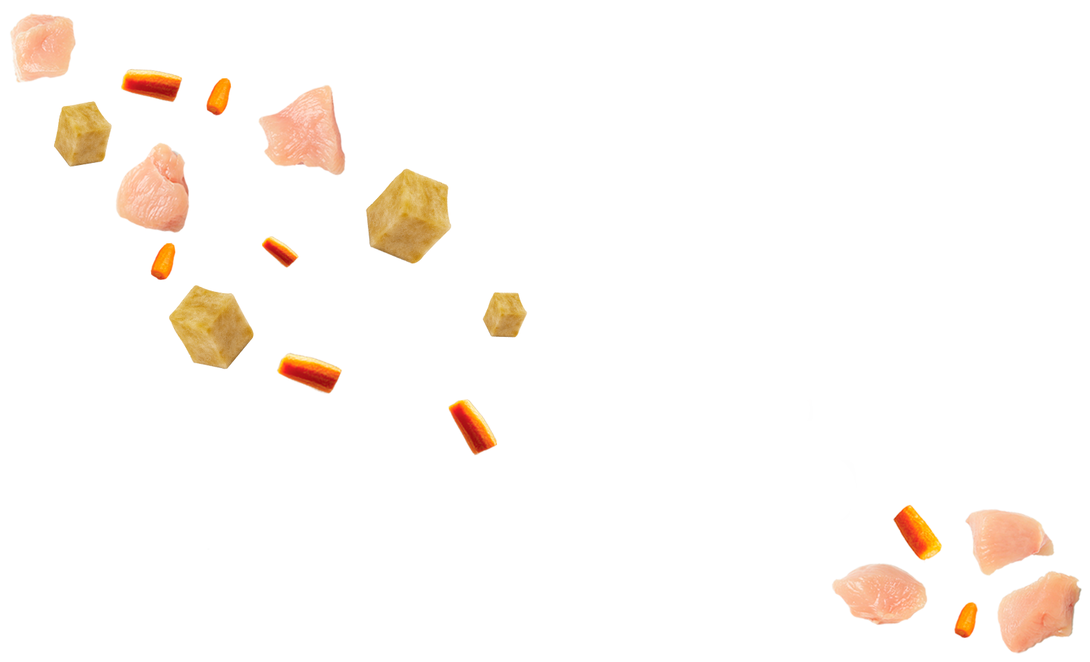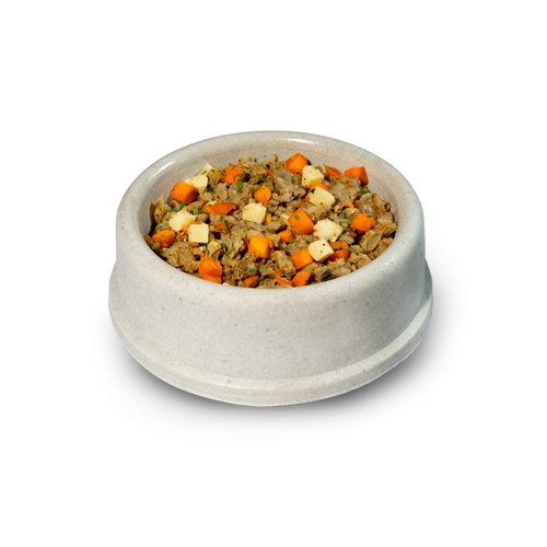 Peito de frango, arroz parboilizado, batata doce, cenoura, aveia em flocos, psyllium em flocos, semente de linhaça, óleo de girassol, óleo de peixe, levedura desidratada e inativada (Saccharomyces cerevisiae), prebiótico parede celular de levedura (MOS- Mananoligossacarideo e betaglucanas), extratos vegetais (yucca, alecrim, chá verde e hortelã) cloreto de sódio (sal comum), ácido fólico, ácido pantotênico, biotina, carbonato de cálcio, cisteína, cloreto de colina, cloreto de potássio, cobalto aminoácido quelato, cobre aminoácido quelato, complexo selênio aminoácido, ferro aminoácido quelato, fosfato bicálcico, glicina, histidina, isoleucina, l-arginina, l-glutamina, l-leucina, l-lisina, l-metionina, l-treonina, l-triptofano, l-valina, magnésio aminoácido quelato, manganês aminoácido quelato, niacina, prolina, tirosina, transquelato de iodo, vitamina a, vitamina b1, vitamina b12, vitamina b2, vitamina b6, vitamina d3, vitamina e, vitamina k3 e zinco aminoácido quelato.